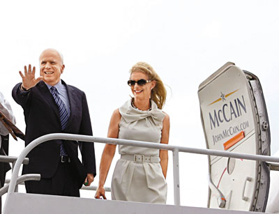 麥凱恩民望追平奧巴馬,夫婦登上專機(jī)時(shí)笑容滿面。