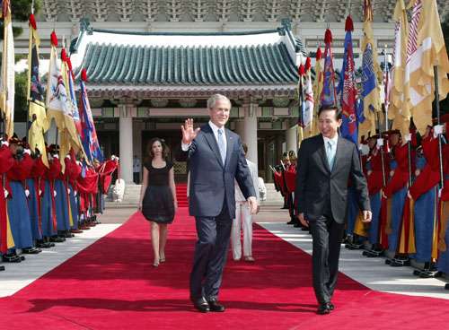 李明博(右)在首爾的歡迎儀式上迎接布什(左)來訪。