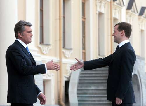俄羅斯總統(tǒng)梅德韋杰夫(右)今年六月會見到訪的烏克蘭總統(tǒng)尤先科(左)。