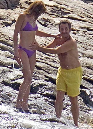 薩科齊夫婦當(dāng)時(shí)正在法國(guó)里維埃拉的家庭別墅度假。照片中的布呂尼身穿一件紫色比基尼,53歲的薩科齊則穿著一件黃色泳褲,他親吻了布呂尼并溫柔地?fù)崦紖文岬母共俊?/p>