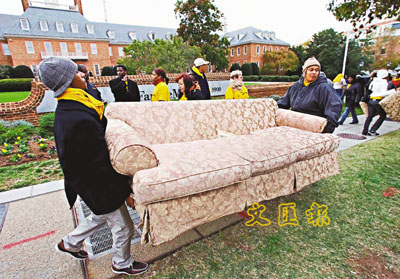 多名業(yè)主29日將家俬搬到房利美,抗議被收樓迫遷。
