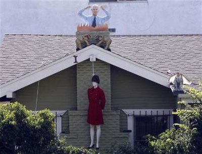 中新網(wǎng)10月29日電 據(jù)香港《文匯報》二十九日報道,美國加州西好萊塢巿有一戶人,在家門口將共和黨副總統(tǒng)候選人佩林的假人吊頸,并在煙囪頂“火燒”麥凱恩的假人,作為萬圣節(jié)裝飾,巿長隨即譴責。