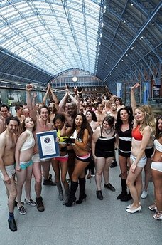 在倫敦的圣潘克拉斯車站,尋求締造最多人聚在一起僅身穿內(nèi)衣的世界紀(jì)錄,同時有數(shù)百人脫得只剩內(nèi)衣,民眾不禁側(cè)目(見圖)。