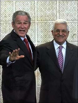 阿巴斯贊揚(yáng)布什是第一個愿意承諾全力支持巴勒斯坦建國的美國總統(tǒng),并給予了紅地毯歡迎。