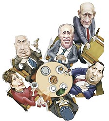 此外,現(xiàn)場(chǎng)也展出多幅諷刺時(shí)局的政治漫畫,包括有個(gè)小孩從本拉登的招牌長(zhǎng)胡須中探出頭,以及以色列首相奧爾默特請(qǐng)辭,各主要政治領(lǐng)袖間合縱連橫的姿態(tài),經(jīng)漫畫家的詮釋,呈現(xiàn)諷刺的喜感。
