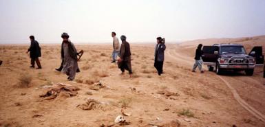 這個位于阿富汗北部達累沙漠的“萬人坑”,據(jù)說曾有1000到2000名塔利班戰(zhàn)俘遺骸。這些人是在2001年11月份,被忠于烏茲別克軍閥阿卜杜拉·拉希德·杜斯塔姆的武裝人員屠殺的。當時,杜斯塔姆將軍配合美國特種部隊戰(zhàn)斗,追擊塔利班武裝。這些塔利班戰(zhàn)俘被塞進密封的集裝箱,很多人窒息而死,另外一些戰(zhàn)俘被裝入箱子后,武裝分子用機槍瘋狂掃射,然后將尸體連同箱子一同焚化。