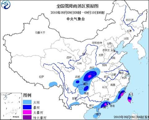 中央氣象臺2010年9月9日06時繼續(xù)發(fā)布暴雨藍色預(yù)警: