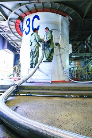 昨日,在西昌衛(wèi)星發(fā)射中心,工作人員對運(yùn)載火箭加注燃料,“嫦娥二號”發(fā)射進(jìn)入倒計(jì)時(shí)。張雷 攝
