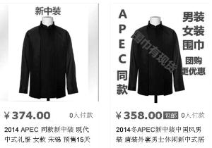 APEC會議上首次亮相的“特色中式服裝”,引起了社會公眾的關注,一些網(wǎng)店的掌柜迅速“嗅到”商機,紛紛推出同款服裝(如圖)。昨天,服裝面料供應商表示只提供私人定制,其他商家無權使用同款面料,網(wǎng)上熱銷的同款服裝均為仿制。