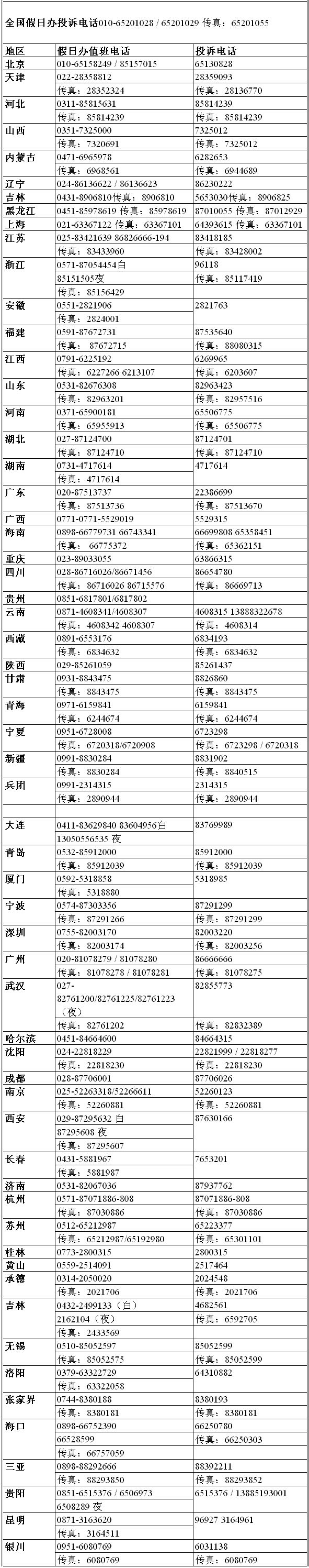 中新網(wǎng)9月26日電 今天,全國假日辦公布了2006年“十一”黃金周各省(區(qū))市假日旅游協(xié)調(diào)機構(gòu)的旅游投訴電話。具體見下表——