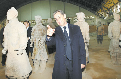 13時,在身著漢代服裝的工作人員的夾道歡迎中,薩科齊來到現(xiàn)代化的全地下遺址博物館漢陽陵博物館參觀。他走進(jìn)坑藏文物展示區(qū),興致勃勃地觀看出土的各式彩陶、漢俑,神情專注地聽取文物發(fā)掘過程和修復(fù)情況的介紹,并不時與博物館專家及隨行人員交流。在短暫的參觀訪問中,無論漢陽陵的家畜陶俑還是精美玉器,都深深地吸引著總統(tǒng)先生。