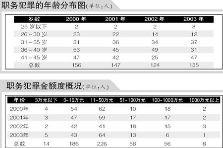 盧鐵峰說,目前,廣州青年職務(wù)犯罪人數(shù)的85%年齡在30歲~45歲,他們掌握了一定權(quán)力,有許多是單位和部門主管等。據(jù)不完全統(tǒng)計(jì),2000年廣州青年職務(wù)犯罪中的單位領(lǐng)導(dǎo)(包括部門領(lǐng)導(dǎo))為98人,2001年為99人,2002年為63人,2003年為71人,其中不乏處級(jí)、廳局級(jí)干部。