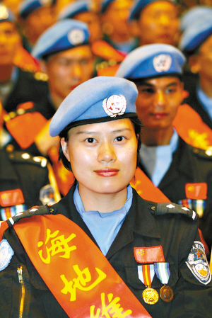 在這支防暴隊(duì)中,有7名女維和隊(duì)員受到了特別的關(guān)注,她們之中,有機(jī)關(guān)領(lǐng)導(dǎo),也有基層檢查員,還有醫(yī)生、護(hù)士;有的已結(jié)婚、有的已有了孩子,擁有幸福美滿的家庭,有的則剛剛走出大學(xué)校門。 第二次參加維和,被隊(duì)員們親切地稱為“大姐姐”的防暴隊(duì)首席聯(lián)絡(luò)官段中慧,總是那么和藹可親;被稱為“超女”的湯筱晶,不僅活躍于各種唱歌和拉歌場(chǎng)合,更是以腿長善跑而令不少男同胞們感到汗顏;有率真活潑“小女孩”張偉,是名副其實(shí)的神槍手;有傲視舞林的馬德芬,作為一名土家族姑娘,她優(yōu)美的舞姿和別具特色的民族舞蹈給全體隊(duì)員留下了深刻的印象;有白衣天使朝鮮族大姐孫花玉;有見人就說“笨豬(法語bonjour,你好!)”的戴紅,還有勇敢堅(jiān)強(qiáng)被親昵地稱為“小黑妹”的黃凌怡。