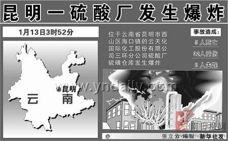 昨日凌晨3時50分許,昆明市西山區(qū)?阪(zhèn)云天化國際化工股份有限公司三環(huán)分公司硫酸廠硫磺倉庫,在硫磺裝卸過程中,硫磺粉塵發(fā)生爆炸并起火燃燒。事故共造成5人死亡,32人受傷,兩人失蹤。