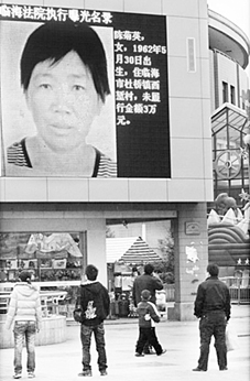 今天(注:1月15日)下午,記者在浙江臺州臨海市崇和門廣場100余平方米的大屏幕上看到,該市法院正把欠債不還的老賴的彩色照片以及家庭住址、職業(yè)和未履行債務(wù)情況等,通過大屏幕進(jìn)行公開循環(huán)播放。
