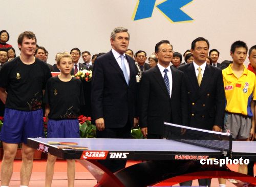 十八日下午,在中國人民大學的“世紀館”內,一場中英兩國的乒乓球友誼賽吸引來兩位“重量級”觀眾——中國總理溫家寶和在華訪問的英國首相布朗。