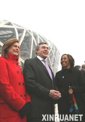 正在中國訪問的英國首相布朗19日上午參觀了“鳥巢”。陪同布朗參觀的有他的夫人薩拉·布朗和英國運動員、雅典奧運會冠軍凱利·霍爾姆斯等訪華隨行人員。