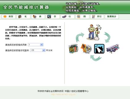 作為科技部、國家發(fā)展改革委、中宣部等六部委聯(lián)合推動(dòng)的“節(jié)能減排全民科技行動(dòng)”的重要內(nèi)容之一,在科技部社會(huì)發(fā)展科技司、中國21世紀(jì)議程管理中心的組織下,在中科院地理科學(xué)與資源研究所的專家們在其承擔(dān)的“十一五”國家科技支撐計(jì)劃項(xiàng)目課題“公民節(jié)能減排潛力指標(biāo)體系”研究成果的基礎(chǔ)上,開發(fā)完成了“全民節(jié)能減排計(jì)算器”。