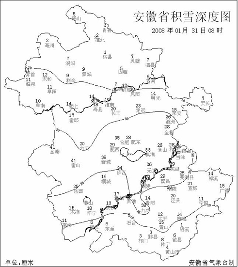 中新網(wǎng)1月31日電 據(jù)問天網(wǎng)消息,安徽省氣象臺(tái)消息,截至今天早晨08時(shí),全省各地仍有積雪,其中沿淮到江南北部積雪深度普遍在10厘米以上,江淮中部和沿江東部超過25厘米,最深金寨、霍山為41厘米。