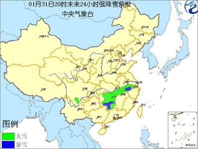 中新網(wǎng)1月31日電 中央氣象臺(tái)今天下午六點(diǎn)鐘發(fā)布大雪預(yù)報(bào):受冷暖空氣的共同影響,預(yù)計(jì)今天夜間到明天白天,湖南大部、湖北東南部、安徽南部、江蘇西南部、浙江西北部、江西北部以及四川高原南部等地有中到大雪,其中,湖南南部、安徽南部的局地有暴雪。