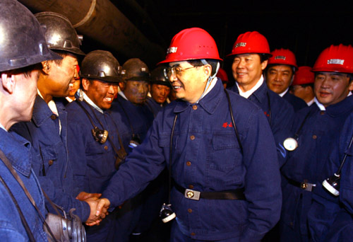 胡錦濤充滿感情地對礦工們說:“大家辛苦了!你們?yōu)榱饲Ъ胰f戶的幸福,為了國家經(jīng)濟社會發(fā)展,在井下埋頭苦干,為保障煤炭供應(yīng)作出了很大貢獻!