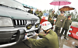 使用迷彩布遮蓋軍車號牌的行為將受到查處。昨日,廣州警備區(qū)協(xié)調(diào)陸、海、空軍、武警和公安,組織開展了打擊假冒軍車行動。廣東省軍區(qū)副參謀長閻學(xué)亭,廣州警備區(qū)司令員顏小明和參謀長張云山,來到現(xiàn)場進行指導(dǎo)。昨日早上在廣氮收費站的查車點,執(zhí)勤人員扣押了9輛冒牌軍車。