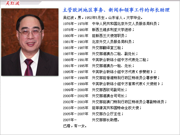 中國外交部資料顯示,吳紅波從二00五年起至二00七年擔(dān)任外交部辦公廳主任一職,二00七年至今擔(dān)任外交部部長助理。劉結(jié)一在二00六年至二00七年一年時(shí)間里,擔(dān)任了外交部美大司司長,二00七年至今一直為外交部部長助理。