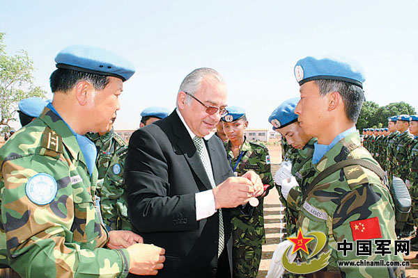 按照聯(lián)合國慣例,為維和部隊授勛一般都是在任務(wù)期滿6個月時舉行。鑒于中國維和部隊在完成任務(wù)過程中表現(xiàn)出色,聯(lián)蘇團決定破例提前兩個月為所有435名中國維和官兵頒發(fā)“和平榮譽勛章”。