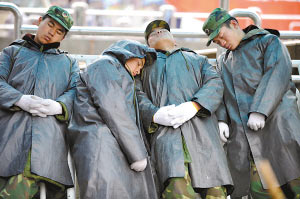 “真是太不好意思了!”下午4點(diǎn)25分,在該部二連會(huì)議室,記者見(jiàn)到了4名戰(zhàn)士的“廬山真面目”。面對(duì)記者的追問(wèn),他們對(duì)“站著睡覺(jué)”一事表現(xiàn)得十分尷尬。“作為班長(zhǎng)骨干,我們更愿意將自己威武剛毅的形象展現(xiàn)給人民群眾,可是由于已經(jīng)連續(xù)奮戰(zhàn)了39個(gè)小時(shí),確實(shí)累得沒(méi)有辦法。從到火車(chē)站執(zhí)行任務(wù)開(kāi)始,背包都沒(méi)有打開(kāi)過(guò)!秉S金華說(shuō)。