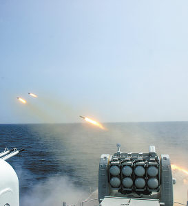 對(duì)“敵”潛艇發(fā)射艦艏火箭深彈(于文獻(xiàn)/攝)