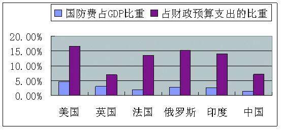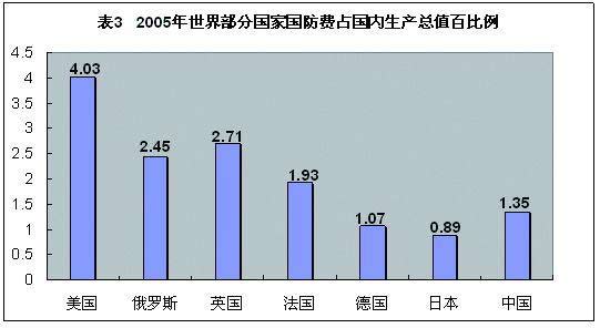 從絕對(duì)指標(biāo)來(lái)看,以2004年為例,美國(guó)的國(guó)防費(fèi)占全球國(guó)防費(fèi)總開(kāi)支的47%,日本占4.1%,而我國(guó)僅占2.4%。從相對(duì)指標(biāo)看,美國(guó)國(guó)防開(kāi)支占GDP的3.9%,我國(guó)是1.38%,其為我國(guó)的2.5倍。在國(guó)民人均國(guó)防費(fèi)開(kāi)支、每平方公里平均國(guó)防費(fèi)等方面,我國(guó)在世界上均處于很低的水平。