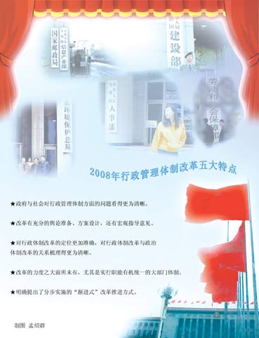 “這次改革真正啟動(dòng)了行政管理體制向提供公共服務(wù)、理順部門(mén)職責(zé)、轉(zhuǎn)變政府職能和突出法治保障4方面的轉(zhuǎn)移!敝袊(guó)政法大學(xué)副校長(zhǎng)馬懷德教授說(shuō)。
