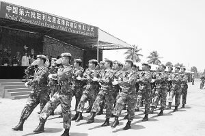 利比里亞蒙羅維亞當(dāng)?shù)貢r(shí)間3月25日上午,中國(guó)第六批駐利比里亞維和部隊(duì)榮獲“和平勛章”授勛儀式在這里隆重舉行。孟德仲 攝