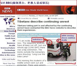 因此,“事件”初期,國際媒體上充耳塞目的是經(jīng)過“精心”剪裁的照片和聳人聽聞的關于拉薩的報道。令人不解的是,在事發(fā)三小時內(nèi),中新社首發(fā)了兩張拉薩古城濃煙滾滾、民眾倉皇奔逃的即時照片,除了華人世界媒體廣泛采用外,可能只能躺在好多西方媒體圖片庫里呻吟了,要知道這是中國媒體最先發(fā)出關于拉薩事件中的第一聲“呻吟”啊,可能是人家剪裁起來不好下手吧!