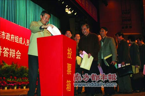 2月26日,南京舉行全市干部大會,與會者包括南京市四套班子領導成員、出席過黨的十七大和江蘇省十一次黨代會的代表等,共300多人。會上,人手一張選票,選票上有51個“填空題”:填寫51個部門區(qū)縣一把手的推薦人選,其中包括南京市政府47名組成人員人選和4位區(qū)(縣)委書記人選。
