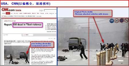 3月17日,CNN網(wǎng)站上使用了一張拉薩事件的圖片,圖中兩輛軍車正向兩名平民駛來--事實上,如果完整展示圖片的話,可以看到當(dāng)時軍車旁有約10名暴徒在向軍車投擲石塊,顯然CNN網(wǎng)站的圖片故意剪裁了暴徒向軍車投擲石塊的圖像。