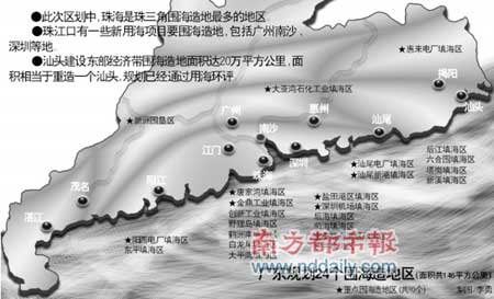 李珠江在昨日的新聞發(fā)布會上表示,新一輪的大發(fā)展,就是要加快建設(shè)粵東、粵西、珠三角三個海洋經(jīng)濟帶,大力發(fā)展能源、石化、鋼鐵和造船四個產(chǎn)業(yè)群,推動扶持30個重大項目建設(shè)投產(chǎn)。新獲批的《區(qū)劃》劃定了146平方公里的圍海造地區(qū),相當于5.5個澳門,最大限度地支持沿海地區(qū)的重大項目用海!秴^(qū)劃》中劃定了24個圍海造地區(qū),重點圍海造地區(qū)有10個(見上圖)。