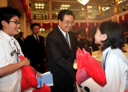 2007年6月19日,胡錦濤主席在北京人民大會堂出席“中日青年世代友好聯(lián)誼晚會”時,日本訪問團中年齡最小的成員橫堀由、大木博來到胡錦濤面前,請胡主席為他們簽名。胡錦濤高興地對他們說,從你們身上,我看到了中日友好事業(yè)的希望。他將兩個北京奧運會的吉祥物“福娃”贈送給他們。兩位日本少年臉上露出喜悅的笑容。
