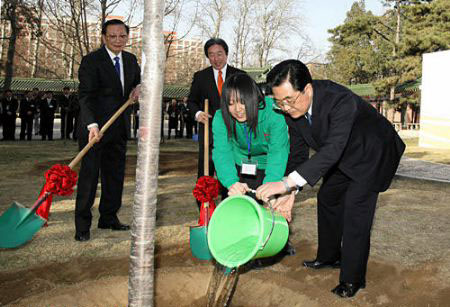 春天是播種希望的季節(jié)。胡錦濤專門來到中國人民大學(xué)百家園,同中日青少年代表一起種植友誼樹。