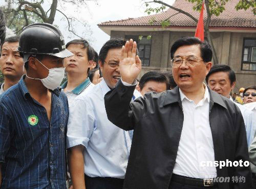 中共中央總書(shū)記、國(guó)家主席、中央軍委主席胡錦濤五月十六日抵達(dá)地震重災(zāi)區(qū)綿陽(yáng)北川查看災(zāi)情,并慰問(wèn)參加搶險(xiǎn)救災(zāi)部隊(duì)指戰(zhàn)員和受災(zāi)群眾。中新社發(fā) 陳文 攝