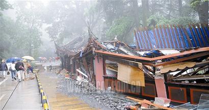 16日下午,記者來(lái)到都江堰景區(qū)二王廟古建筑群門(mén)口,廟門(mén)已經(jīng)殘缺不全,地上四處是殘磚斷瓦,建筑群內(nèi)的多個(gè)大殿坍塌。循著廟門(mén)朝山上看,廟內(nèi)紅磚青瓦的幽然境界如今已不復(fù)存在,處處是墻倒塌后露出的懸崖陡坡。一度是俯瞰整個(gè)都江堰水利工程的最佳觀(guān)景點(diǎn)的秦燕樓,更是只留幾堵殘?jiān)珨啾凇?/p>