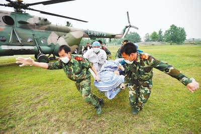 根據(jù)小分隊(duì)提供的信息,17日下午,綿竹市聯(lián)合陸軍航空兵某部對(duì)清平鄉(xiāng)重傷員實(shí)施了緊急救援。這是自12日發(fā)生地震后,從清平鄉(xiāng)接出的首批受傷群眾。(李 舸攝影報(bào)道)