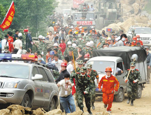 據(jù)戰(zhàn)士介紹,他們今天看到至少有4名以上幸存者從北川的廢墟中被搶救出來(lái),其中還包括一對(duì)80多歲的夫婦。