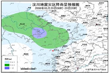 汶川地震災(zāi)區(qū)降雨量預(yù)報(bào)圖(20日08時(shí)-20日20時(shí))