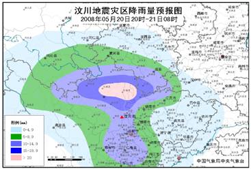 汶川地震災(zāi)區(qū)降雨量預(yù)報(bào)圖(20日20時(shí)-21日08時(shí))