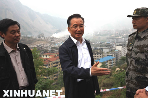 下午5時(shí)10分許,一抵達(dá)綿陽機(jī)場,溫家寶總理就和國務(wù)院副總理回良玉、國務(wù)委員馬凱以及總指揮部其他成員一起改乘直升機(jī)前往北川察看唐家山堰塞湖,看望禹里鄉(xiāng)準(zhǔn)備轉(zhuǎn)移的群眾,并前往在地震中遭受嚴(yán)重毀壞的北川縣城,了解受災(zāi)情況。