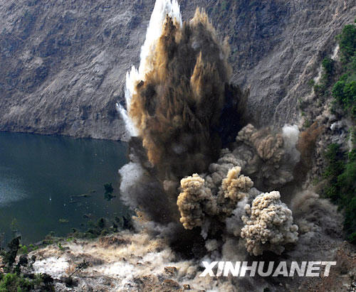 汶川地震發(fā)生后,青川縣青竹江石板溝一帶形成蓄水1200多萬(wàn)立方米水的堰塞湖,威脅著下游數(shù)萬(wàn)人安危,其中蓄水超過(guò)800萬(wàn)立方米的石板溝堰塞湖被水利專家定為高危湖。隨著雨季來(lái)臨,高70多米的堤壩隨時(shí)都可能出現(xiàn)險(xiǎn)情。為防止意外發(fā)生,武警水電三總隊(duì)對(duì)石板溝堰塞湖大壩實(shí)施了泄洪口爆破。