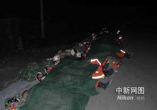 圖為在地震災(zāi)區(qū)艱苦條件下風(fēng)餐露宿的山東消防官兵。(作 者:魯泰霄)