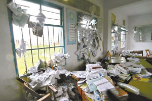 龍卷風(fēng)把教師辦公室內(nèi)的課桌、書籍等吹得一片凌亂。