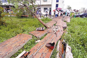 此外,強(qiáng)大的龍卷風(fēng)同時還造成低垌的兩間小學(xué)17間課室損毀,學(xué)校圍墻1700米坍塌;上述三村莊62間房屋也不同程度損毀,530多畝香蕉等農(nóng)作物受災(zāi);6000多米的供電、郵電線路被損壞。據(jù)當(dāng)?shù)赜嘘P(guān)部門初步統(tǒng)計,持續(xù)10多分鐘的龍卷風(fēng)已造成當(dāng)?shù)負(fù)p失達(dá)1000多萬元。